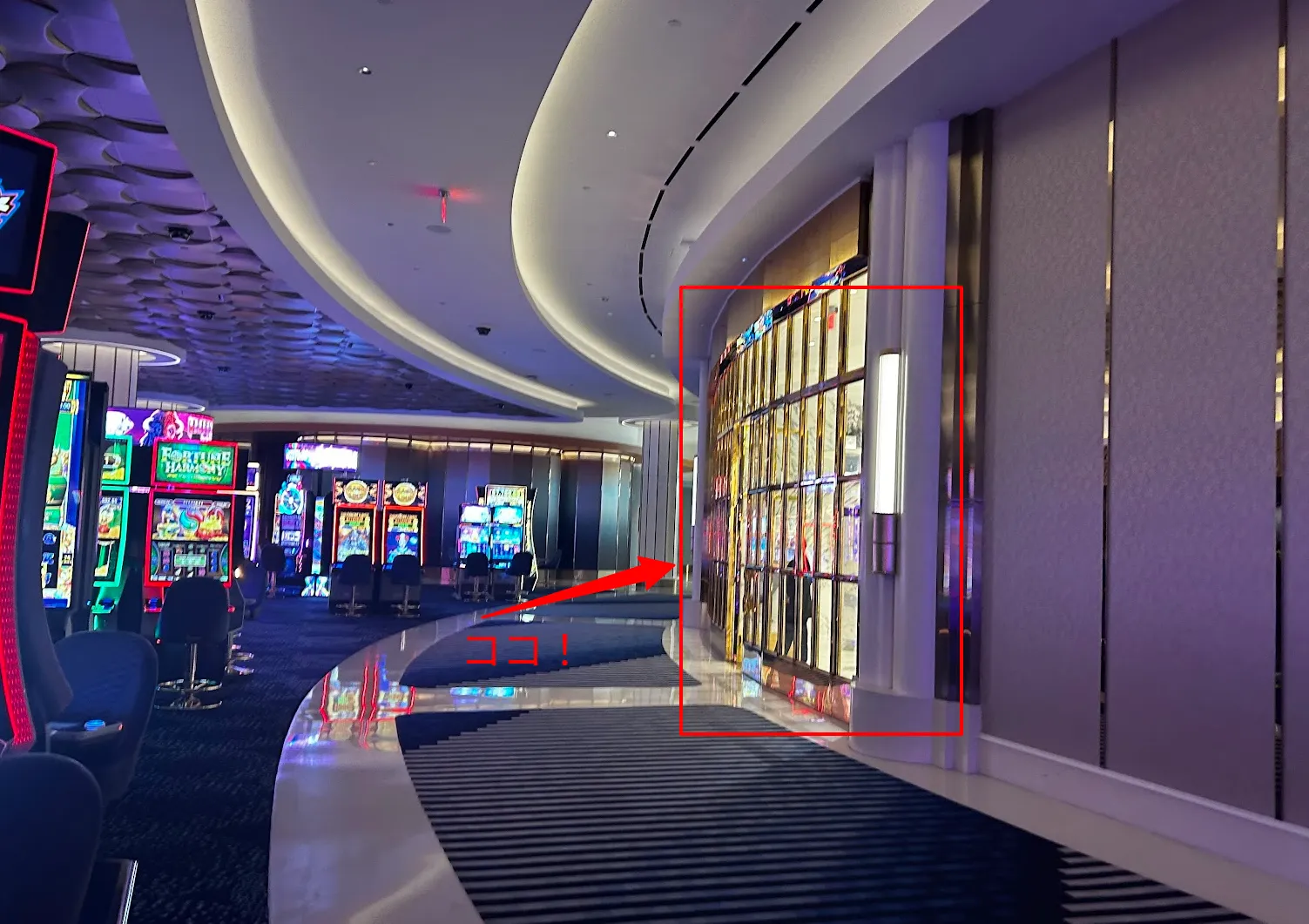途中カジノや豪華なバーの横を通って、正面入り口から徒歩5分ほどで店舗が見えてきます。